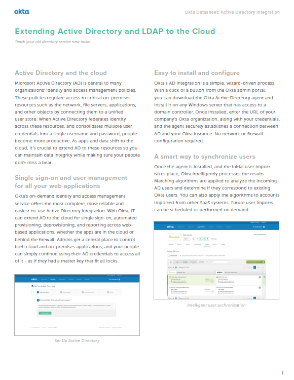 As explained in this datasheet, Okta’s on-demand identity and access management service offers the most complete, robust and easy to use Active Directory integration that enables IT to extend AD to the cloud for SSO, automated provisioning, deprovisioning, and reporting across web-based applications, whether they are in the cloud or behind the firewall.