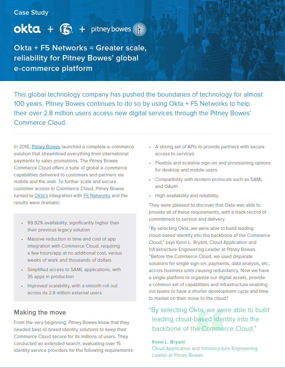 This global technology company has pushed the boundaries of technology for almost 100 years. Pitney Bowes continues to do so by using Okta + F5 Networks to help their over 2.8 million users access new digital services through the Pitney Bowes’ Commerce Cloud.
