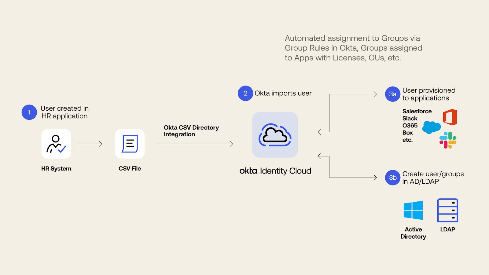 It doesn’t get more straightforward than this method. A CSV file must be generated from an HR system, like ADP, and then ingested into Okta using a provisioning agent. Once you import the identities, you’ll have the same functionality as if you were using a pre-integrated application, such as scheduled imports, attribute-level mastering, matching rules, and a rich profile of user attributes.