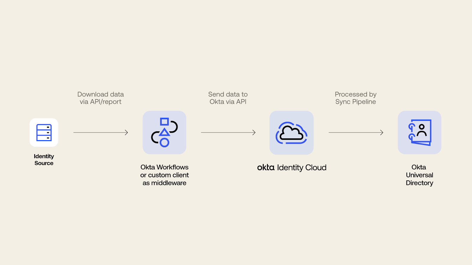 Okta recently introduced Anything-as-a-Source (XaaS) to the synchronization lineup. As the name suggests, you can import identities from any source of truth into Okta and, as a result, use Okta as a single control plane for Identity and Access Management.  This option will be a good fit if you’re looking to maximize no-code automation with Workflows as the middleware and its increasing number of templates.