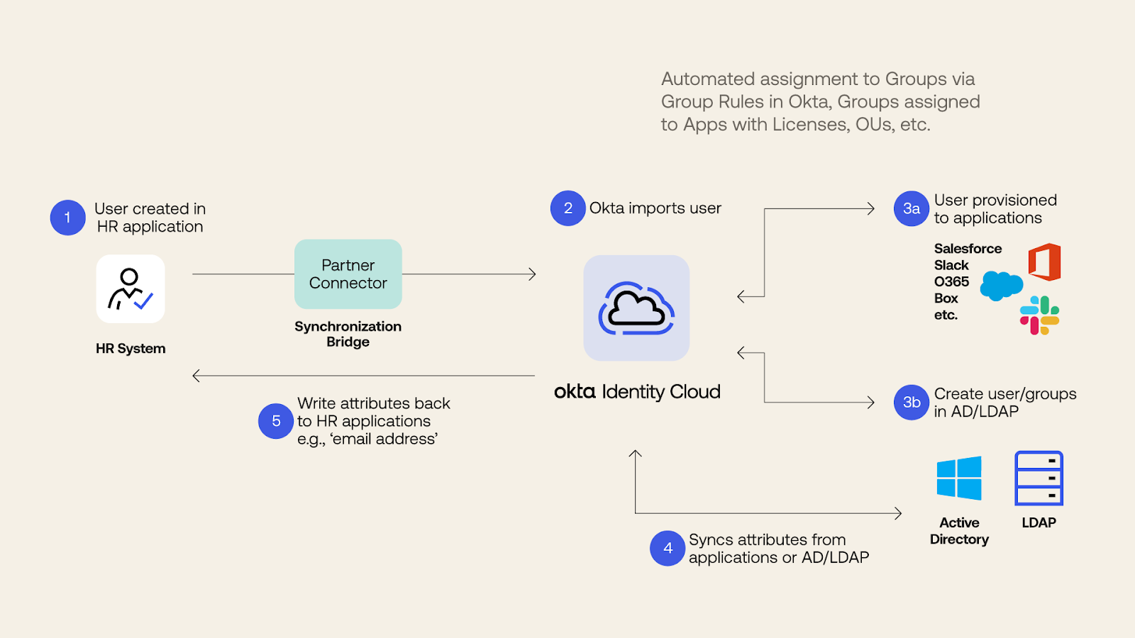 Okta and the partner connector work together to source various attributes, centralize them, and then grant or revoke access to other applications. Unlike the CSV method, with partner connectors, there is the opportunity to write attributes back to the original source.