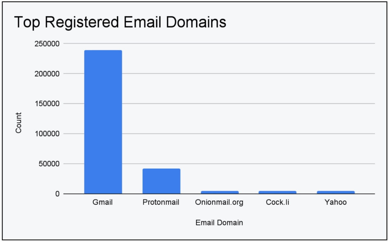 Gmail was the top email domain used by threat actors to register on BreachForums, however, the forum did not verify email accounts.
