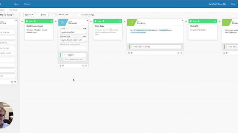 Use Workflows to send SMS messages. This is a sub flow that will allow you to send an SMS message via Twilio. A Twilio trial account is needed.