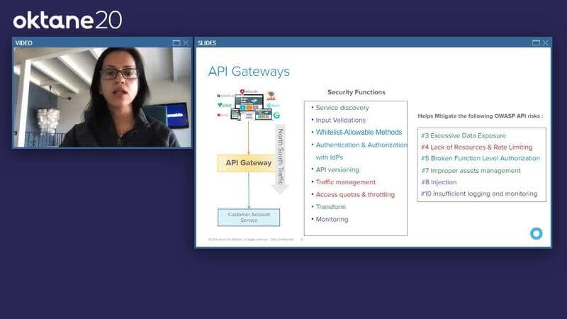 Payal Pan: Then I get this question all the time from customers. Hey, I have an API gateway in place. Is that enough? Isn't that enough for my API security? While the API gateway provides a lot of the key functions from securing your API standpoint you still need to be able to do the authentication authorization from a user, or a client standpoint. This is where the who has access to what is where the identity and access management solution comes into picture with something like Okta.