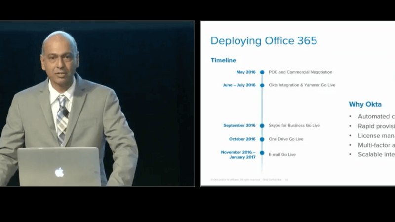 Arun: Yeah, as I said, thank you for the question. No, actually, to be truthful, we already had Okta in place before Office 365 and there was the line of thought saying, well, you know, why should we deal with Okta? Let's just use Azure AD and ADFS? And I can tell you we tried and we fail miserably, right? On the flip side of it, we had some design with Okta Professional Services, two hours here, two hours there. And in the span of four hours, we connected everything. It was totally seamless, there were no issues, there was nothing. And I'm so glad for that.